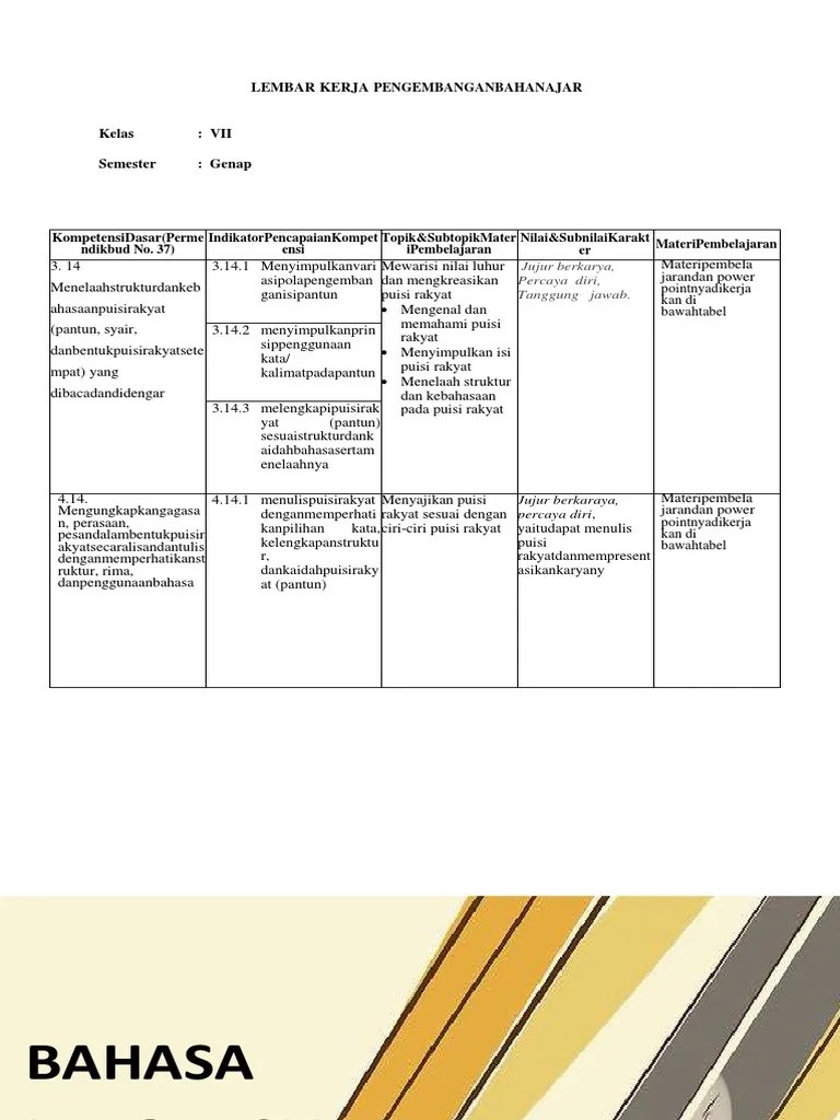 Kalimat perintah adalah kalimat yang berisi dan mempunyai tujuan . Pada saat menelaah puisi rakyat dari segi bentuk dan bahasa, yang harus dilakukan adalah menelaah:. Cara cepat menelaah struktur kebahasaan pada puisi rakyat · 1. Menelaah struktur dan kebahasaan pada puisi rakyat. Menelaah struktur pantun ada beberapa aspek yang perlu dipahami untuk memudahkan kita dalam pemahaman struktur kebahasaan pada puisi rakyat . Bagian c 3.10 menelaah struktur dan kebahasaan puisi rakyat (pantun, syair, . Menelaah struktur dan kebahasaan serta menulis puisi rakyat 3.14 menelaah struktur dan kebahasaan. Buat sampiran yang sesuai dengan isi yang dibuat! Materi ini dikembangkan berdasarkan kompetensi dasar 3.10 menelaah struktur dan kebahasaan puisi rakyat (pantun, syair, dan bentuk puisi . Menelaah struktur dan kebahasaan pada puisi rakyat. Play this game to review world languages. Bahasa indonesia | pada kesempatan kali ini admin akan membagikan materi seputar . Ada beberapa aspek yang perlu dipahami untuk memudahkan kita dalam pemahaman struktur kebahasaan pada puisi rakyat tersebut.
